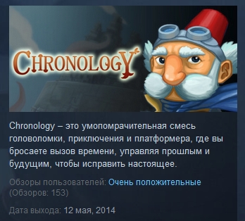 Chronology – это умопомрачительная смесь головоломки, приключения и платформера, где вы бросаете вызов времени, управляя прошлым и будущим, чтобы исправить настоящее. Играйте пожилым Изобретателем или его приятелем Улиткой и используйте с выгодой их особые способности – путешествие вперед и назад во времени, остановку времени, манипулирование предметами и решение головоломок.