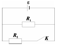 45. В цепи, изображенной на рисунке, тепловая мощность, выделяемая во внешней цепи, одинакова при разомкнутом и замкнутом ключе K. Определите внутреннее сопротивление источника, если R1=12 Ом, R2=4 Ом.