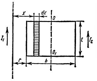 18. Прямой бесконечный ток I1 = 5А и прямоугольная рамка с током I2 = 3А расположены в одной плоскости так, что сторона рамки l = 1 м параллельна прямому току и отстоит от него на расстоянии r = 0,1 b, где b – длина другой стороны рамки. Определить, какую работу необходимо совершить для того, чтобы повернуть рамку на угол α = 90° относительно оси OO1, параллельной прямому току и проходящей через середины противоположных сторон рамки b.