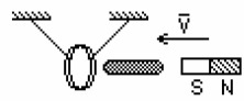 25. В вертикальной плоскости подвешено на двух нитях медное кольцо (см. рис.). В него один раз вдвигается ненамагниченный стальной стержень, другой раз магнит. Влияет ли в движение стержня и магнита на положение кольца?