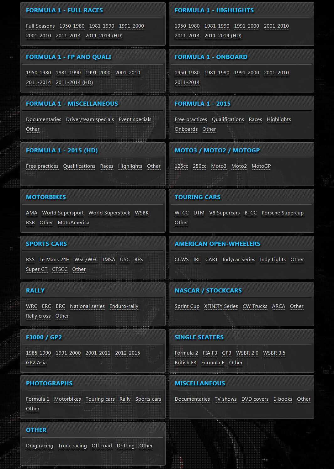 Racingfor.me – интересный специализированный трекер, посвященный тематике авто и мото - гоночного спорта. На трекере содержится огромное количество видеоматериала, посвященного гоночному спорту, в том числе трансляции гонок «Формула 1» в высоком качестве. Если вы фанат гоночного спорта, любитель высоких скоростей, то инвайт на racingfor.me позволит вам узнать и увидеть много интересного из жизни F1, Formula 2, Formula 3, Formula BMW, World Series by Renault WRC и многое другое.