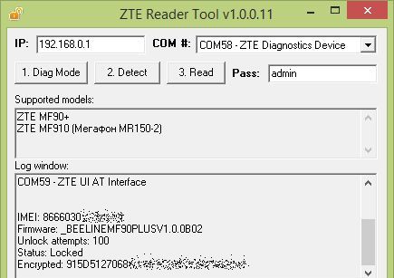 4. Запускаем приложение ZTE Reader Tool и вводим IP-адрес устройства и пароль для входа в web-интерфейс (по-умолчанию 192.168.0.1 и admin)