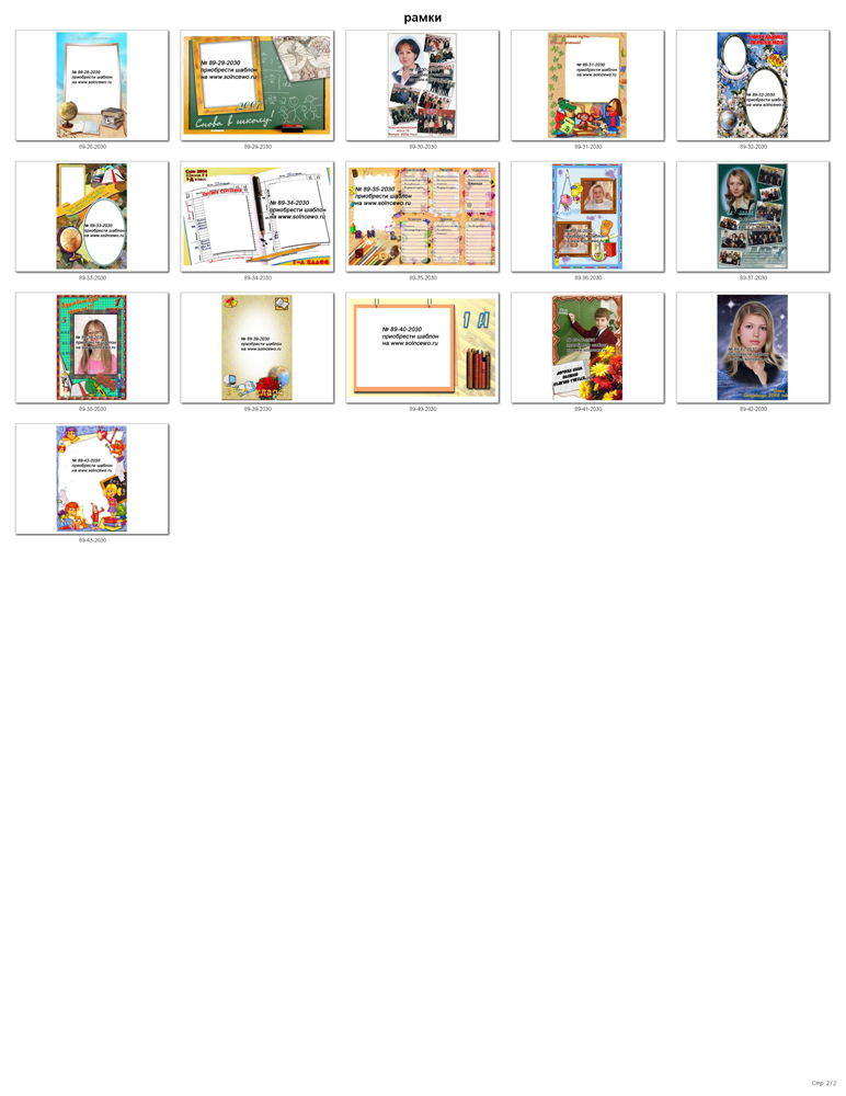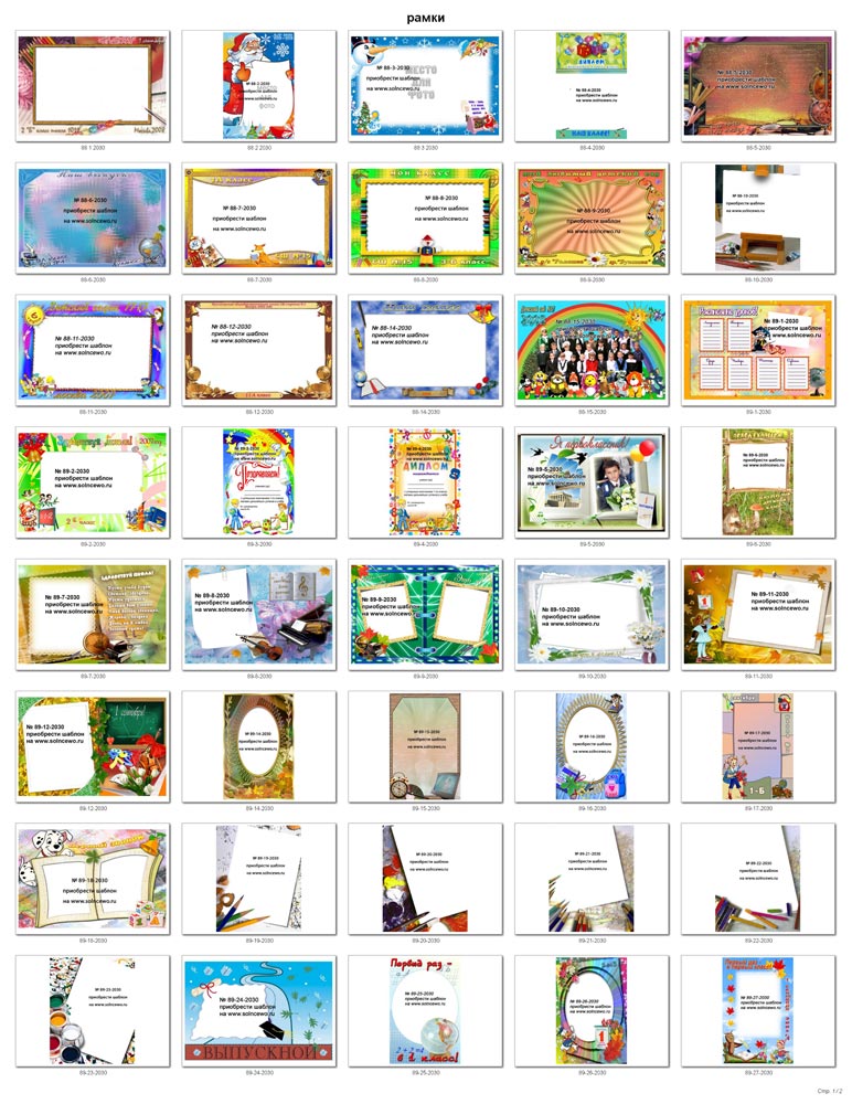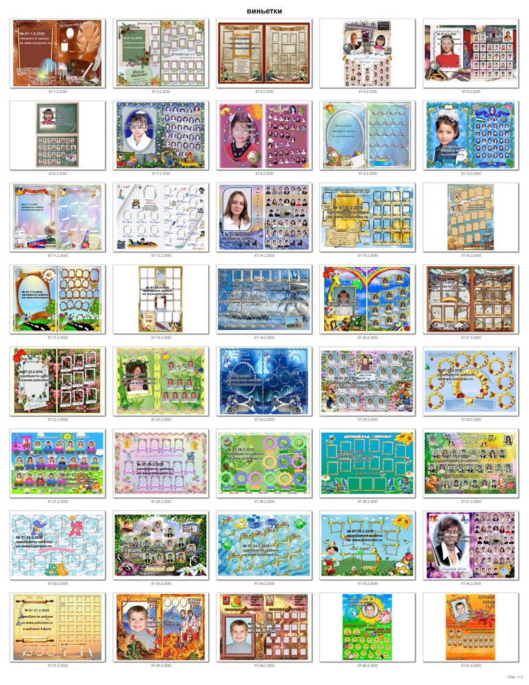Комплект шаблонов для Photoshop для ШКОЛЬНОГО ФОТОГРАФА. В наборе 155 шаблонов общим объёмом 4.7 Гб в сжатом виде. Это виньетки для школы и детского садика, рамки для общих фотографий и рамки для портретов. Все шаблоны имеют следующие параметры - 20 см Х 30 см, 300 dpi, некоторые виньетки состоят из двух листов формата 20 см Х 30 см, 300 dpi. Все шаблоны представлены в формате PSD и каждый элемент расположен на отдельном слое, что допускает полное редактирование шаблонов, в частности изменение размеров и количества рамок для размещения портретов детей, изменение подписей и надписей (содержание, размеры, шрифт) и.т.д. Для уменьшения объёма группы шаблонов сжаты в архивы RAR.
