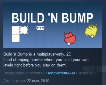 Inspired by the classic DOS game Jump ´n Bump, Build ´n Bump retains all of the same head-stomping, multiplayer fun with a twist. You can build your own levels right before you play on them!