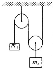 84. На рисунке изображена система блоков, к которым подвешены грузы массами m1 = 200 г и m2 = 500 г. Считая, что груз m1 поднимается, а подвижный блок с m2 опускается, нить и блок невесомы, силы трения отсутствуют, определите: 1) силу натяжения нити Т; 2) ускорения, с которыми движутся грузы.