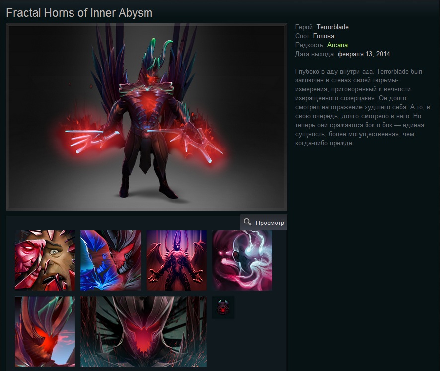 Описание: Глубоко в аду внутри ада, Terrorblade был заключен в стенах своей тюрьмы-измерения, приговоренный к вечности извращенного созерцания. Он долго смотрел на отражение худшего себя. А то, в свою очередь, долго смотрело в него. Но теперь они сражаются бок о бок — единая сущность, более могущественная, чем когда-либо прежде.