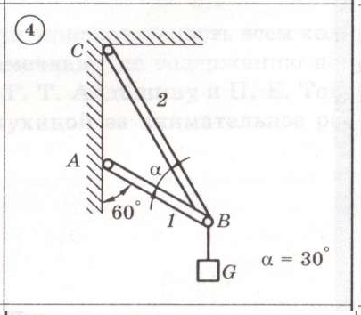 Задание С1 по теме система сходящихся сил: Для представленных на схемах 1-30 механических систем найти усилия в опорных стержнях 1 и 2. Вес груза G = 10 кН, стержни, блоки и тросы невесомы. Решение задачи для варианта: 4