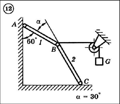 Для представленной на рисунке механической системы найти усилия в опорных стержнях 1 и 2. Вес груза G = 10кН, стержни, блоки и тросы невесомы