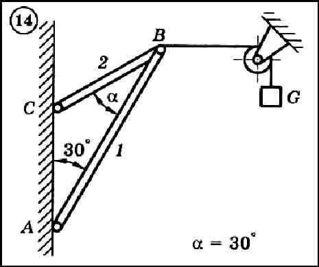 Для представленной на рисунке механической системы найти усилия в опорных стержнях 1 и 2. Вес груза G = 10кН, стержни, блоки и тросы невесомы