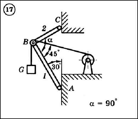 Для представленной на рисунке механической системы найти усилия в опорных стержнях 1 и 2. Вес груза G = 10кН, стержни, блоки и тросы невесомы