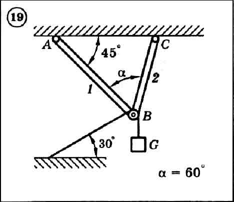 Для представленной на рисунке механической системы найти усилия в опорных стержнях 1 и 2. Вес груза G = 10кН, стержни, блоки и тросы невесомы