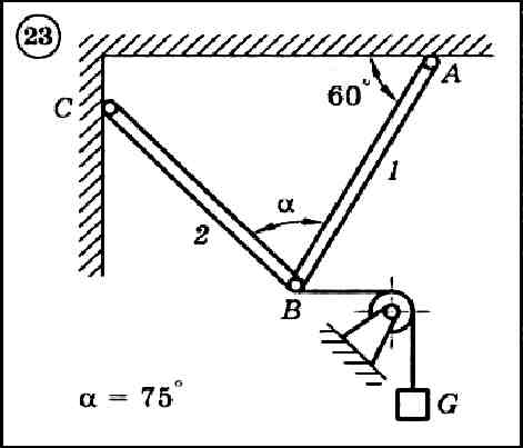 Для представленной на рисунке механической системы найти усилия в опорных стержнях 1 и 2. Вес груза G = 10кН, стержни, блоки и тросы невесомы