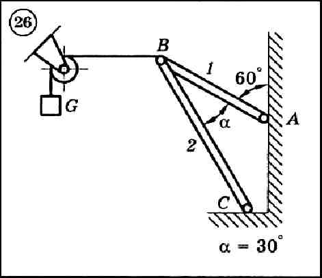 Для представленной на рисунке механической системы найти усилия в опорных стержнях 1 и 2. Вес груза G = 10кН, стержни, блоки и тросы невесомы