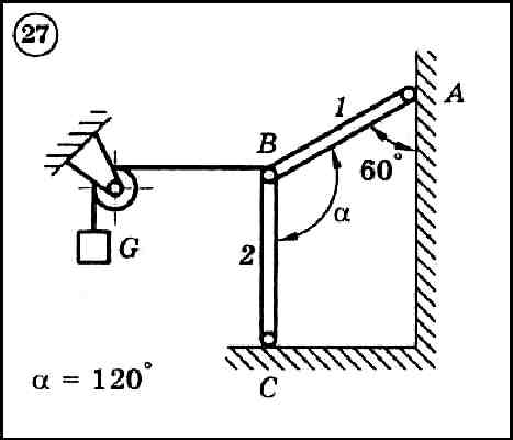 Для представленной на рисунке механической системы найти усилия в опорных стержнях 1 и 2. Вес груза G = 10кН, стержни, блоки и тросы невесомы
