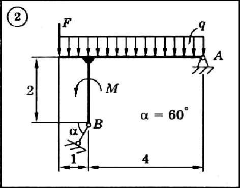 Для представленного на схеме тела определить реакции опор. Приведенные на схеме нагрузки имеют следующие величины: вес груза G = 10 кН, сила F = 10кН, момент пары сил М = 20 кНм, интенсивность распределенной силы q = 5 кН/м, а также qmax = 5 кН/м. Размеры указаны в метрах. Весом тела следует пренебречь.