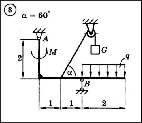 Для представленного на схеме тела определить реакции опор. Приведенные на схеме нагрузки имеют следующие величины: вес груза G = 10 кН, сила F = 10кН, момент пары сил М = 20 кНм, интенсивность распределенной силы q = 5 кН/м, а также qmax = 5 кН/м. Размеры указаны в метрах. Весом тела следует пренебречь.
