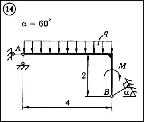Для представленного на схеме тела определить реакции опор. Приведенные на схеме нагрузки имеют следующие величины: вес груза G = 10 кН, сила F = 10кН, момент пары сил М = 20 кНм, интенсивность распределенной силы q = 5 кН/м, а также qmax = 5 кН/м. Размеры указаны в метрах. Весом тела следует пренебречь.