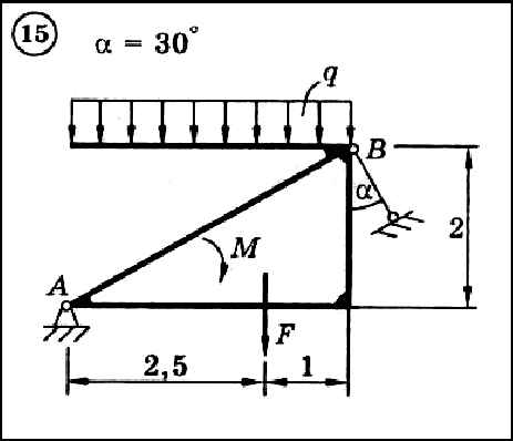 Для представленного на схеме тела определить реакции опор. Приведенные на схеме нагрузки имеют следующие величины: вес груза G = 10 кН, сила F = 10кН, момент пары сил М = 20 кНм, интенсивность распределенной силы q = 5 кН/м, а также qmax = 5 кН/м. Размеры указаны в метрах. Весом тела следует пренебречь.