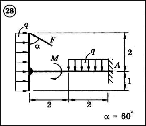 Для представленного на схеме тела определить реакции опор. Приведенные на схеме нагрузки имеют следующие величины: вес груза G = 10 кН, сила F = 10кН, момент пары сил М = 20 кНм, интенсивность распределенной силы q = 5 кН/м, а также qmax = 5 кН/м. Размеры указаны в метрах. Весом тела следует пренебречь.