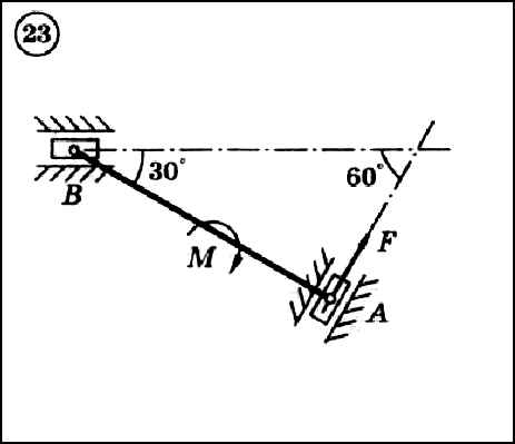 Для представленного на схеме механизма, расположенного в вертикальной плоскости, определить значение силы F из условия равновесия механизмов. Механизм состоит из однородного тонкого стержня AB длиной l = 4 м и весом G = 15 кН и двух невесомых ползунов А и B, которые могут перемещаться по направляющим. На стержень действует сила с моментом M = 20кНм. Трение у ползуна B отсутствует, коэффициент трения ползуна A по направляющей f = 0,4. Размерами ползунов пренебречь.