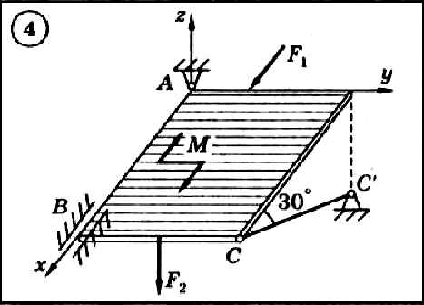 Для представленного на схеме тела определить реакции опор. Тело предствляет собой однородную прямоугольную плиту весом G = 12 кН, имеющую размеры |AB| = 6м и |BC| = 2м. Плита закреплена с помощью трех опор: шарнирно-неподвижной опоры (сферический шарнир) в точке А, подшипниковой опоры в точке В и опорного стержня в точке С. На плиту действует: пара сил с моментом М = 10 кНм, и в серединах соответствующих сторон - горизонтальная сила F1 = 6 кН и вертикальная сила F2 = 8 кН.