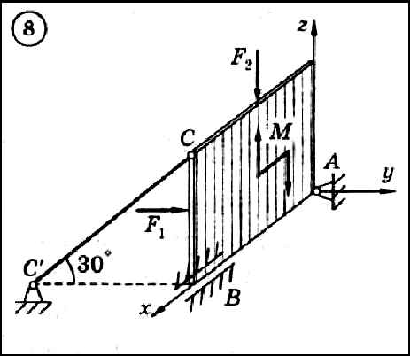 Для представленного на схеме тела определить реакции опор. Тело предствляет собой однородную прямоугольную плиту весом G = 12 кН, имеющую размеры |AB| = 6м и |BC| = 2м. Плита закреплена с помощью трех опор: шарнирно-неподвижной опоры (сферический шарнир) в точке А, подшипниковой опоры в точке В и опорного стержня в точке С. На плиту действует: пара сил с моментом М = 10 кНм, и в серединах соответствующих сторон - горизонтальная сила F1 = 6 кН и вертикальная сила F2 = 8 кН.