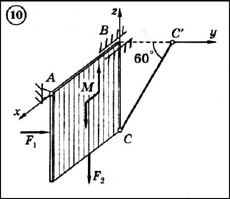 Для представленного на схеме тела определить реакции опор. Тело предствляет собой однородную прямоугольную плиту весом G = 12 кН, имеющую размеры |AB| = 6м и |BC| = 2м. Плита закреплена с помощью трех опор: шарнирно-неподвижной опоры (сферический шарнир) в точке А, подшипниковой опоры в точке В и опорного стержня в точке С. На плиту действует: пара сил с моментом М = 10 кНм, и в серединах соответствующих сторон - горизонтальная сила F1 = 6 кН и вертикальная сила F2 = 8 кН.