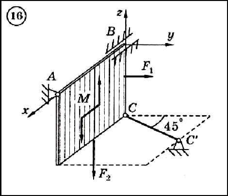 Для представленного на схеме тела определить реакции опор. Тело предствляет собой однородную прямоугольную плиту весом G = 12 кН, имеющую размеры |AB| = 6м и |BC| = 2м. Плита закреплена с помощью трех опор: шарнирно-неподвижной опоры (сферический шарнир) в точке А, подшипниковой опоры в точке В и опорного стержня в точке С. На плиту действует: пара сил с моментом М = 10 кНм, и в серединах соответствующих сторон - горизонтальная сила F1 = 6 кН и вертикальная сила F2 = 8 кН.