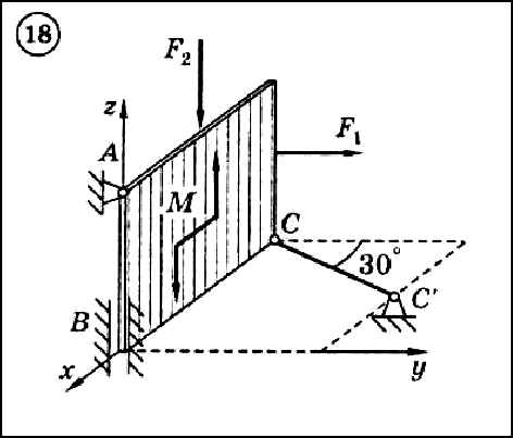Для представленного на схеме тела определить реакции опор. Тело предствляет собой однородную прямоугольную плиту весом G = 12 кН, имеющую размеры |AB| = 6м и |BC| = 2м. Плита закреплена с помощью трех опор: шарнирно-неподвижной опоры (сферический шарнир) в точке А, подшипниковой опоры в точке В и опорного стержня в точке С. На плиту действует: пара сил с моментом М = 10 кНм, и в серединах соответствующих сторон - горизонтальная сила F1 = 6 кН и вертикальная сила F2 = 8 кН.