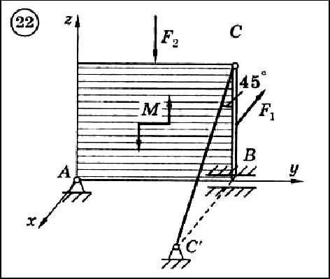 Для представленного на схеме тела определить реакции опор. Тело предствляет собой однородную прямоугольную плиту весом G = 12 кН, имеющую размеры |AB| = 6м и |BC| = 2м. Плита закреплена с помощью трех опор: шарнирно-неподвижной опоры (сферический шарнир) в точке А, подшипниковой опоры в точке В и опорного стержня в точке С. На плиту действует: пара сил с моментом М = 10 кНм, и в серединах соответствующих сторон - горизонтальная сила F1 = 6 кН и вертикальная сила F2 = 8 кН.