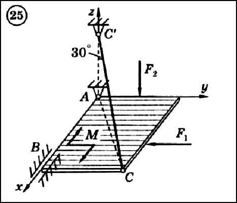 Для представленного на схеме тела определить реакции опор. Тело предствляет собой однородную прямоугольную плиту весом G = 12 кН, имеющую размеры |AB| = 6м и |BC| = 2м. Плита закреплена с помощью трех опор: шарнирно-неподвижной опоры (сферический шарнир) в точке А, подшипниковой опоры в точке В и опорного стержня в точке С. На плиту действует: пара сил с моментом М = 10 кНм, и в серединах соответствующих сторон - горизонтальная сила F1 = 6 кН и вертикальная сила F2 = 8 кН.