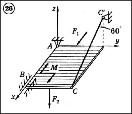 Для представленного на схеме тела определить реакции опор. Тело предствляет собой однородную прямоугольную плиту весом G = 12 кН, имеющую размеры |AB| = 6м и |BC| = 2м. Плита закреплена с помощью трех опор: шарнирно-неподвижной опоры (сферический шарнир) в точке А, подшипниковой опоры в точке В и опорного стержня в точке С. На плиту действует: пара сил с моментом М = 10 кНм, и в серединах соответствующих сторон - горизонтальная сила F1 = 6 кН и вертикальная сила F2 = 8 кН.