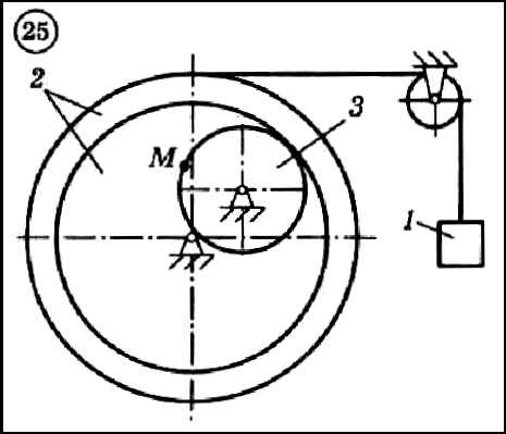 Для приведенной ниже схемы механизма по заданному уравнению движения тела 1 - x(t) определить и показать на рисунке скорость и ускорение точки М, а также скорость и ускорение груза 1 в данный момент времени. Исходные данные, включая радиусы шестерен, шкивов и барабанов, приведены в таблице.