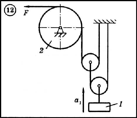 Для приведенной на схеме механической системы, используя принцип Даламбера, определить величину силы F, необходимую для перемещения груза с заданным ускорением a1, а также усилие в грузовом тросе. Исходные данные: массы груза m1 и барабана m2, радиус барабана R2 (у двойного барабана имеется также r2), его радиус инерции ρ2 (если он не задан, тело считать однородным цилиндром), угол α и коэффициент трения скольжения f приведены в таблице. Непронумерованные блоки и катки считать невесомыми. Трением на осях барабана и блоков пренебречь.