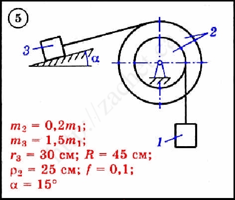 Для приведенной на схеме механической системы, используя теорему об изменении кинетической энергии в дифференциальной форме, определить линейное ускорение тела 1. Нити невесомы и нерастяжимы. Принятые обозначения: m - массы тел, R и r - радиусы, ρ - радиус инерции (если он не указан, тело считать однородным цилиндром); при наличии терния указываются f - коэффициент трения скольжения, fк - коэффициент трения качения.