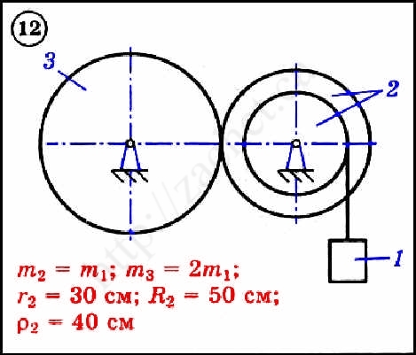 Для приведенной на схеме механической системы, используя теорему об изменении кинетической энергии в дифференциальной форме, определить линейное ускорение тела 1. Нити невесомы и нерастяжимы. Принятые обозначения: m - массы тел, R и r - радиусы, ρ - радиус инерции (если он не указан, тело считать однородным цилиндром); при наличии терния указываются f - коэффициент трения скольжения, fк - коэффициент трения качения.