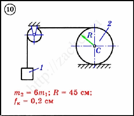 Для приведенной на схеме механической системы, используя теорему об изменении кинетической энергии в интегральной форме, определить линейную скорость тела 1 после его заданного перемещения φ1 = 2π рад или s1 = 2 м. Движение начинается из состояния покоя.