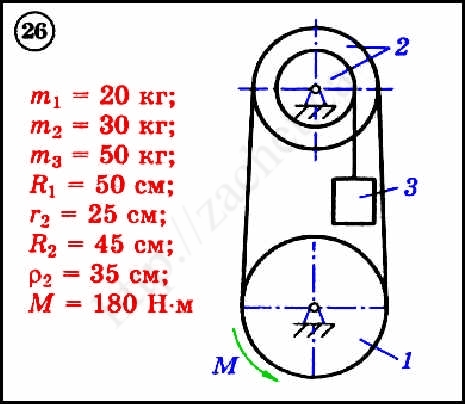 Для приведенной на схеме механической системы, используя теорему об изменении кинетической энергии в интегральной форме, определить линейную скорость тела 1 после его заданного перемещения φ1 = 2π рад или s1 = 2 м. Движение начинается из состояния покоя.