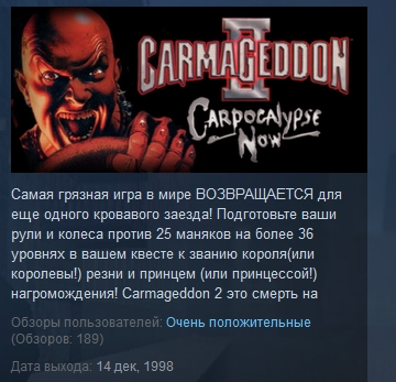 ★ Игра Carmageddon 2: Carpocalypse Now впервые вышла на PC в 1998 году и сразу же стала хитом. По всему миру было продано более 2 миллионов копий игр серии. Вы можете прочитать выдержки из статей в игровой прессе того времени: