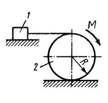Однородный каток 2 весом 4 кН связан с телом 1 нерастяжимой нитью. Радиус R = 0,5 м, коэффициент трения качения ? = 0,005 м, момент пары сил М = 50 Н·м. Определить наибольший вес тела 1, при котором оно начнет скользить, если коэффициент трения скольжения для катка и тела f = 0,2. (Ответ 150)