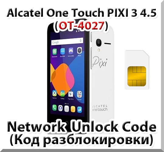 Разблокировка телефона Alcatel Pixi 3 (4.5) 4027 осуществляется по IMEI с помощью уникального NCK кода полученного конкретно под Ваш телефон. Покупатель получает NCK код, соответствующий его IMEI и Provider ID автоматически, сразу же после оплаты.