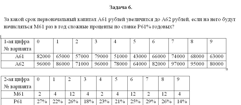 За какой срок первоначальный капитал А61 рублей увеличится до А62 рублей, если на него будут начисляться М61 раз в год сложные проценты по ставке Р61% годовых?
