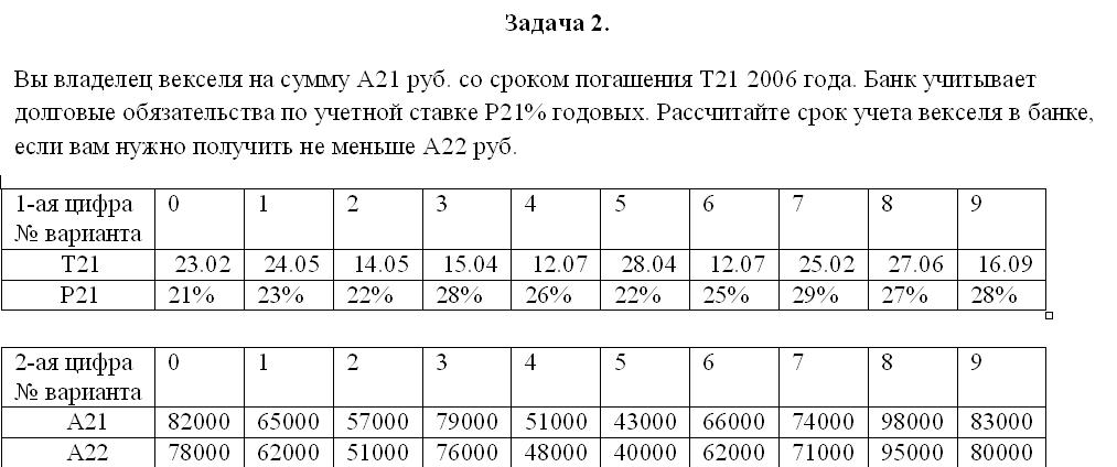 Вы владелец векселя на сумму А21 руб. со сроком погашения Т21 2006 года. Банк учитывает долговые обязательства по учетной ставке Р21% годовых. Рассчитайте срок учета векселя в банке, если вам нужно получить не меньше А22 руб.