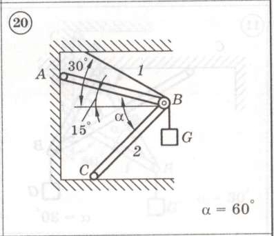 Задание Статика 1 (С1) по теме система сходящихся сил: Для представленных на схемах 1-30 механических систем найти усилия в опорных стержнях 1 и 2. Вес груза G = 10 кН, стержни, блоки и тросы невесомы. Решение задачи для варианта: 20