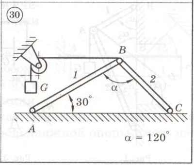 Задание Статика 1 (С1) по теме система сходящихся сил: Для представленных на схемах 1-30 механических систем найти усилия в опорных стержнях 1 и 2. Вес груза G = 10 кН, стержни, блоки и тросы невесомы. Решение задачи для варианта: 30