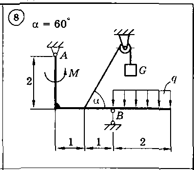 Для представленных на схемах 1-30 тел определить реакции опор. Приведенные на схемах нагрузки имеют следующие величины: вес груза G = 10 кН, сила F = 10 кН, момент пары сил М = 20 кН*м, интенсивность распределенной силы q = 5 кН/м, а также gmax = 5 кН/м. Размеры указаны в метрах. Весом тела следует пренебречь..