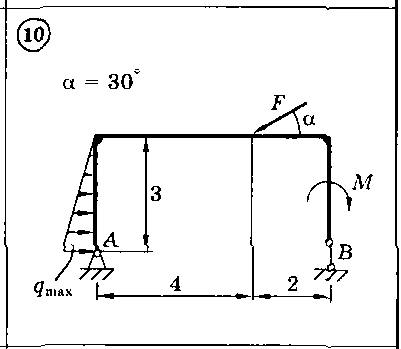 Для представленных на схемах 1-30 тел определить реакции опор. Приведенные на схемах нагрузки имеют следующие величины: вес груза G = 10 кН, сила F = 10 кН, момент пары сил М = 20 кН*м, интенсивность распределенной силы q = 5 кН/м, а также gmax = 5 кН/м. Размеры указаны в метрах. Весом тела следует пренебречь..