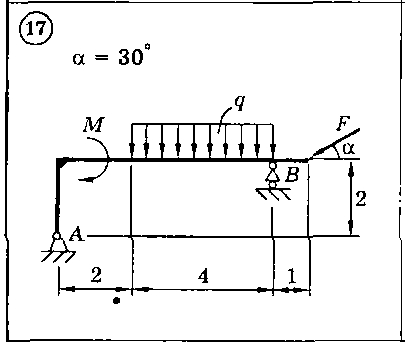 Для представленных на схемах 1-30 тел определить реакции опор. Приведенные на схемах нагрузки имеют следующие величины: вес груза G = 10 кН, сила F = 10 кН, момент пары сил М = 20 кН*м, интенсивность распределенной силы q = 5 кН/м, а также gmax = 5 кН/м. Размеры указаны в метрах. Весом тела следует пренебречь..