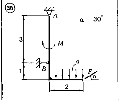 Для представленных на схемах 1-30 тел определить реакции опор. Приведенные на схемах нагрузки имеют следующие величины: вес груза G = 10 кН, сила F = 10 кН, момент пары сил М = 20 кН*м, интенсивность распределенной силы q = 5 кН/м, а также gmax = 5 кН/м. Размеры указаны в метрах. Весом тела следует пренебречь..