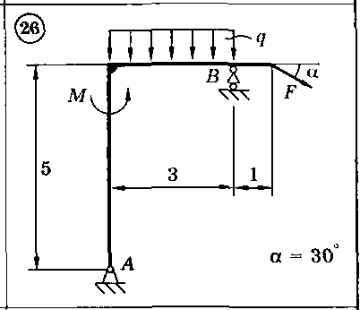 Для представленных на схемах 1-30 тел определить реакции опор. Приведенные на схемах нагрузки имеют следующие величины: вес груза G = 10 кН, сила F = 10 кН, момент пары сил М = 20 кН*м, интенсивность распределенной силы q = 5 кН/м, а также gmax = 5 кН/м. Размеры указаны в метрах. Весом тела следует пренебречь..